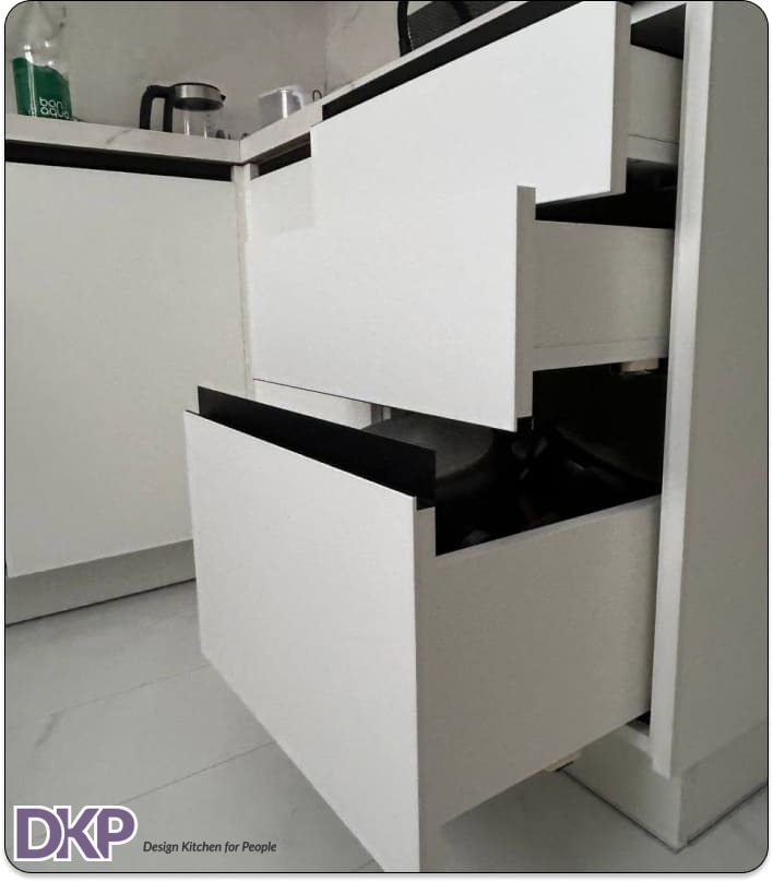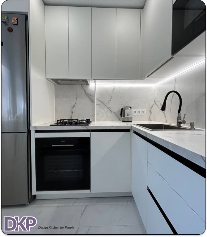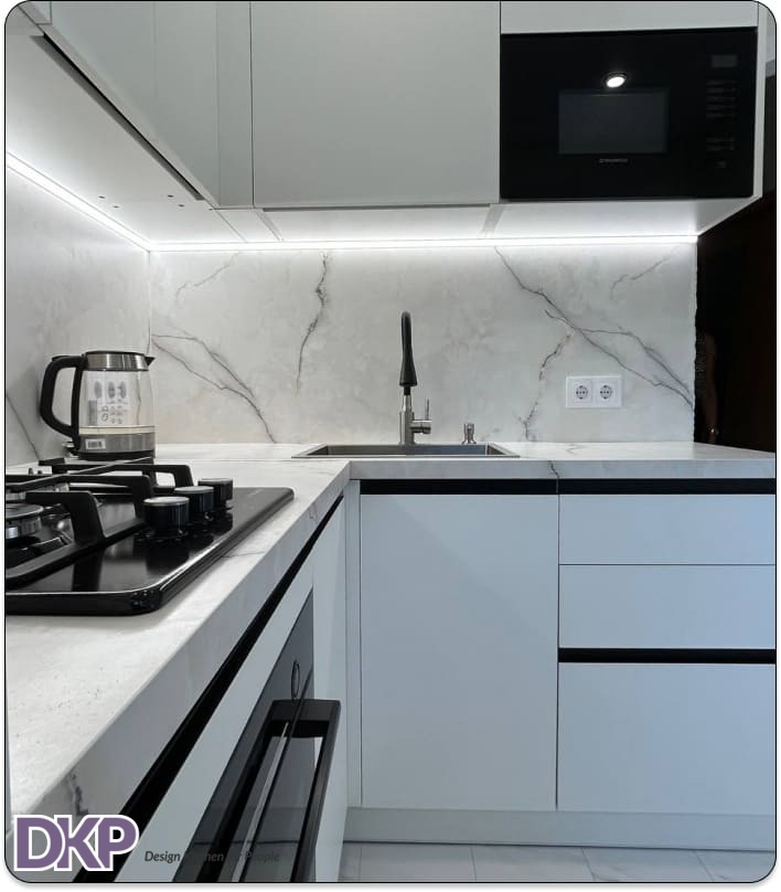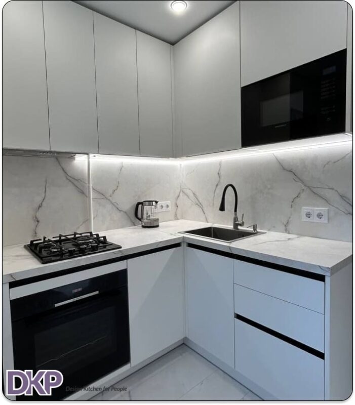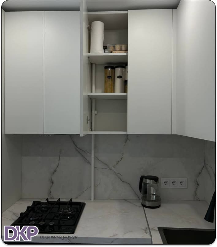 В стоимость входит: вкладыш для приборов, сушка для посуды, подсветка, петли Blum, газлифты, нажимные механизмы Tip-ON;