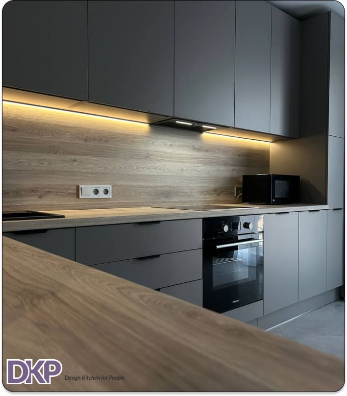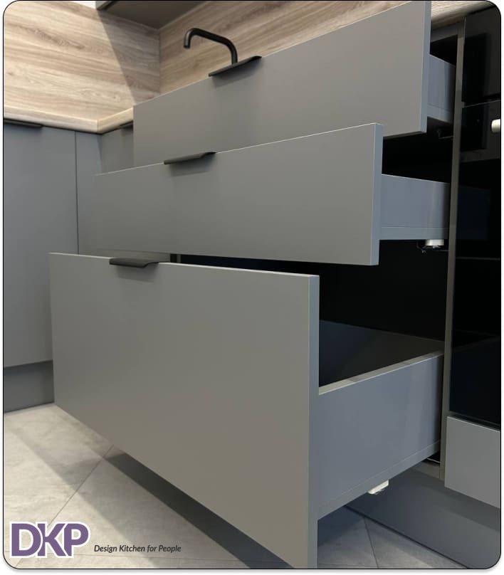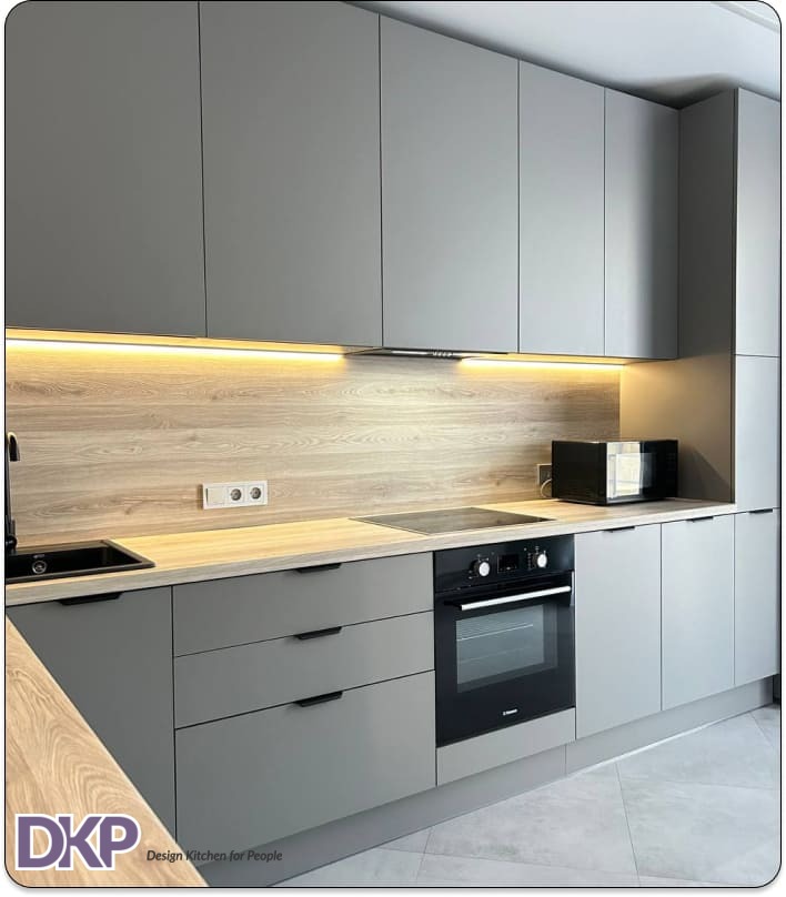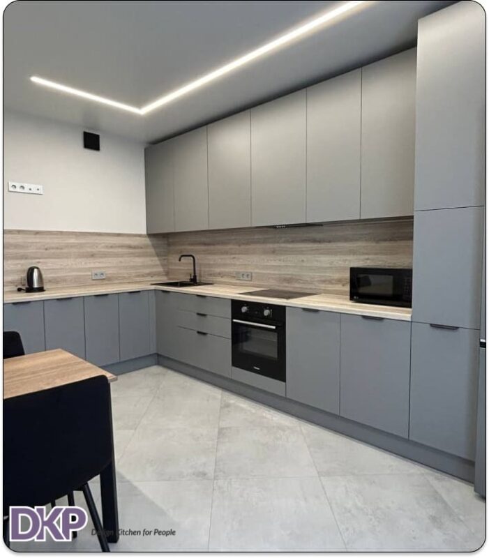 В стоимость входит: вкладыш для приборов, сушка для посуды, ручки мебельные, подсветка, нажимные механизмы Tip-ON, петли Intermat.